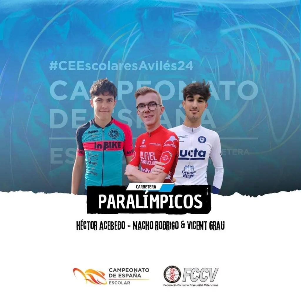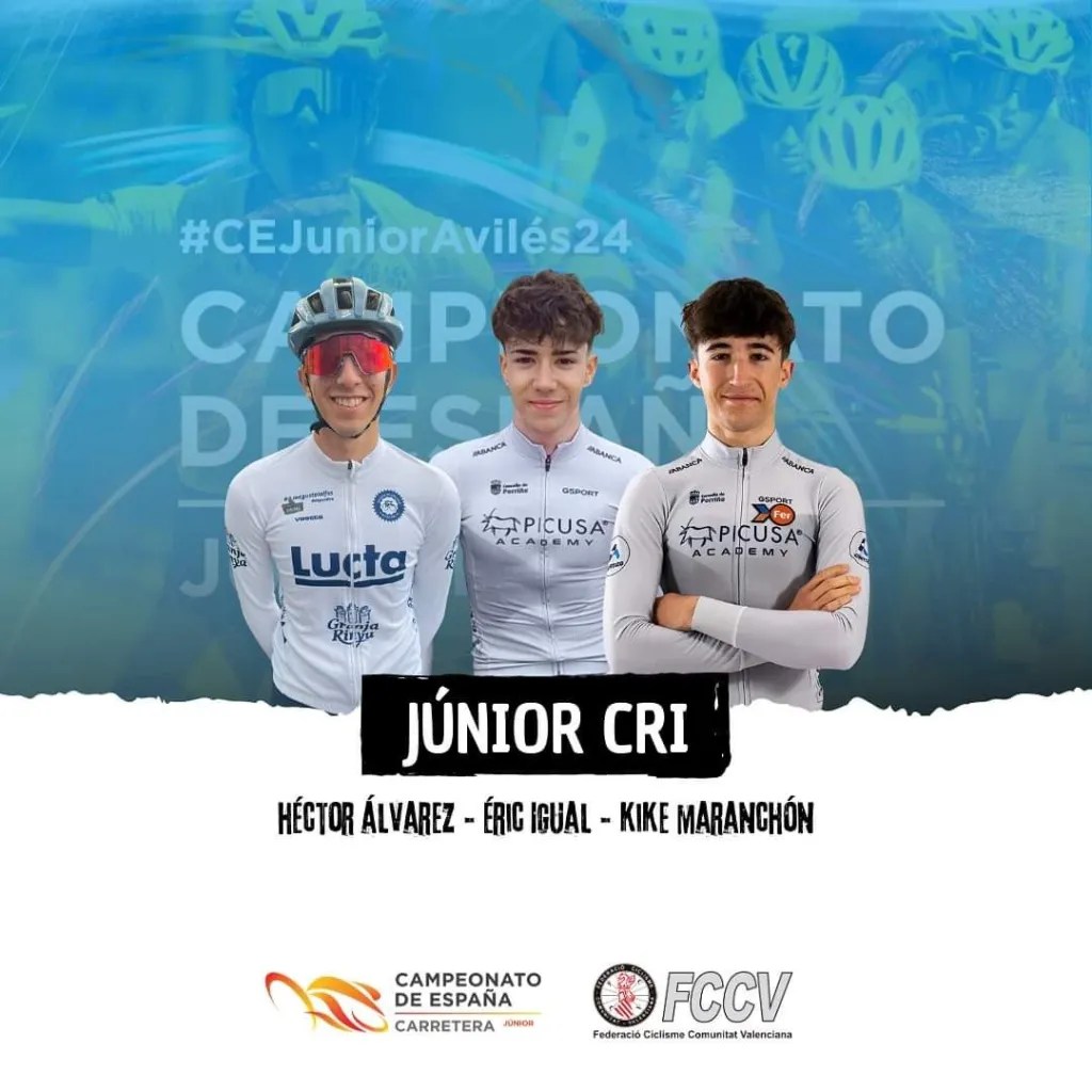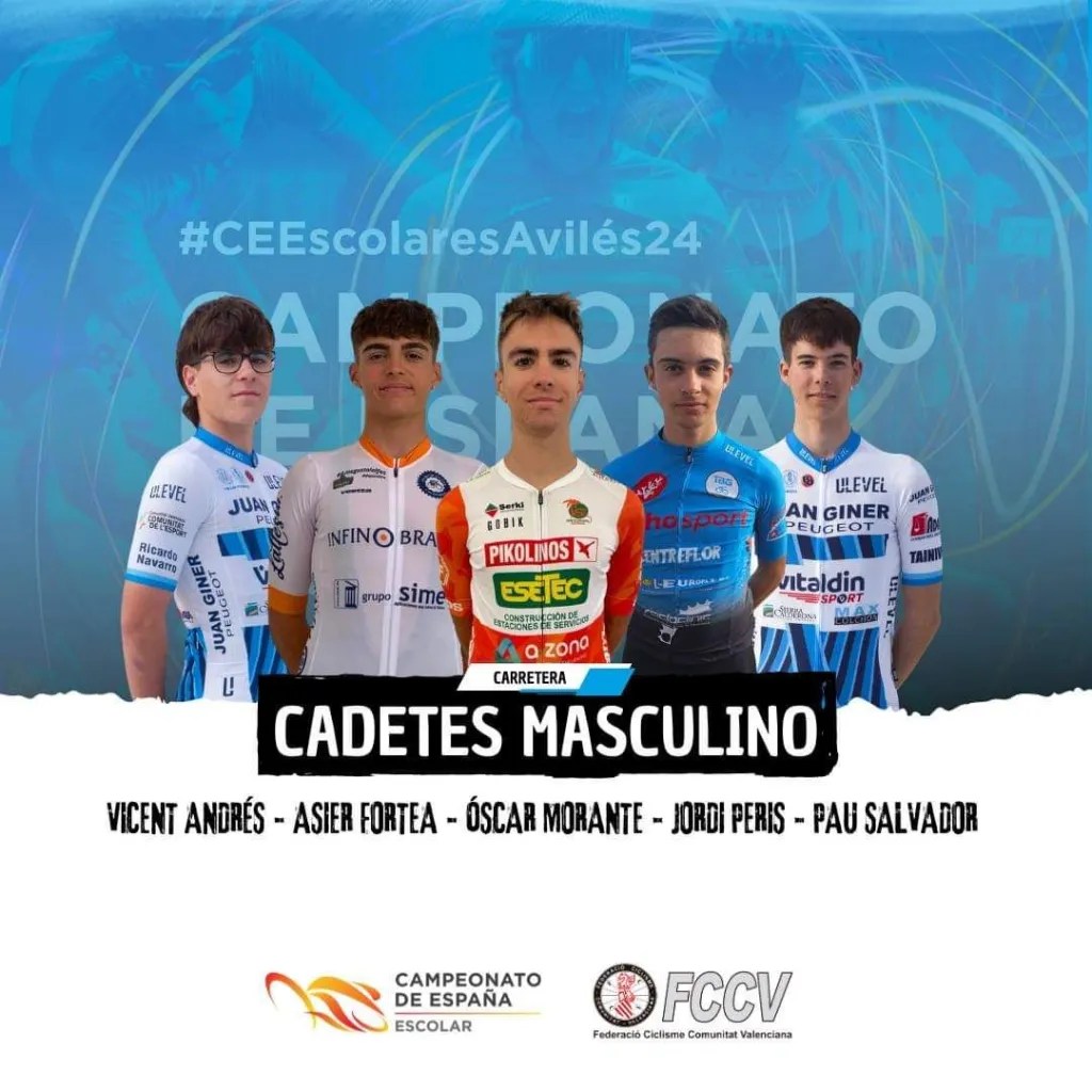 En la categoría cadete, Vicent Andrés y Noa Jiménez realizan la CRI. En la crono por escuadras, los chicos competirán con Jordi Peris, Pau Salvador, Asier Ortega y Óscar Morante.