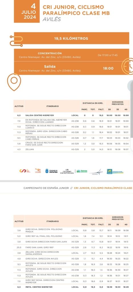 El Centro Niemeyer de Avilés será el centro neurálgico de este Campeonato de España Escolar y Júnior acogiendo las llegadas y salidas tanto de las contrarrelojes como de las pruebas en ruta. Cabe destacar un año más el marcado carácter inclusivo de estos Campeonatos Júnior, que contará con la participación de ciclistas paralímpicos de la clase MB. Hoy, 4 de julio, esperan las CRE Cadetes (masculino y femenino. 15 horas), CRI Cadetes (masculino y femenino. 16 horas), las CRI Júnior (masculino y femenino), 18 horas, además de los Paralímpicos, que todavía no tienen confirmada la hora. El combinado de la FCCV sueña con vestirse con el maillot rojigualdo en todas las pruebas