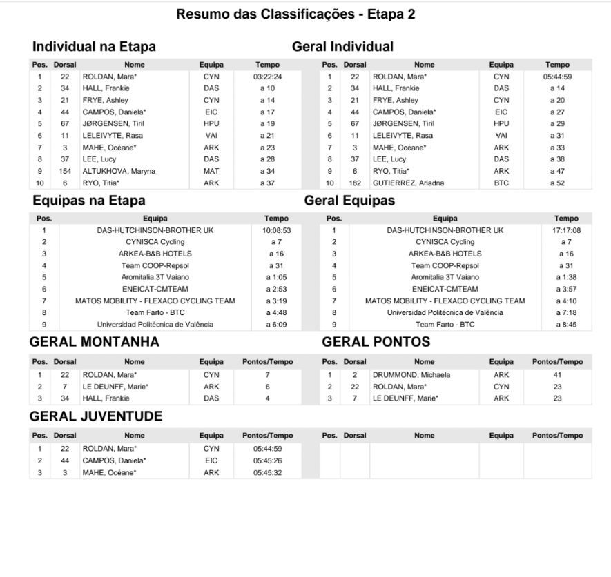La líder del Cynisca Cycling lidera con 14 segundos de ventaja sobre Francesca Hall. Ashley Frye es tercera, 2», y Daniela Campos está a las afueras del podio, en cuarta posición, a 27 segundos del primer lugar. Además del maillot amarillo Placard, María Roldán es dueña del maillot blanco del IPDJ, al mejor joven, y del maillot azul, al mejor escalador. La anterior propietaria del maillot amarillo, la neozelandesa Michaela Drummond (Arkéa-B&B Hotels) viste ahora el maillot rojo de Cofidis, con puntos. El equipo británico DAS-Hutchinson-Brother UK lidera los equipos.