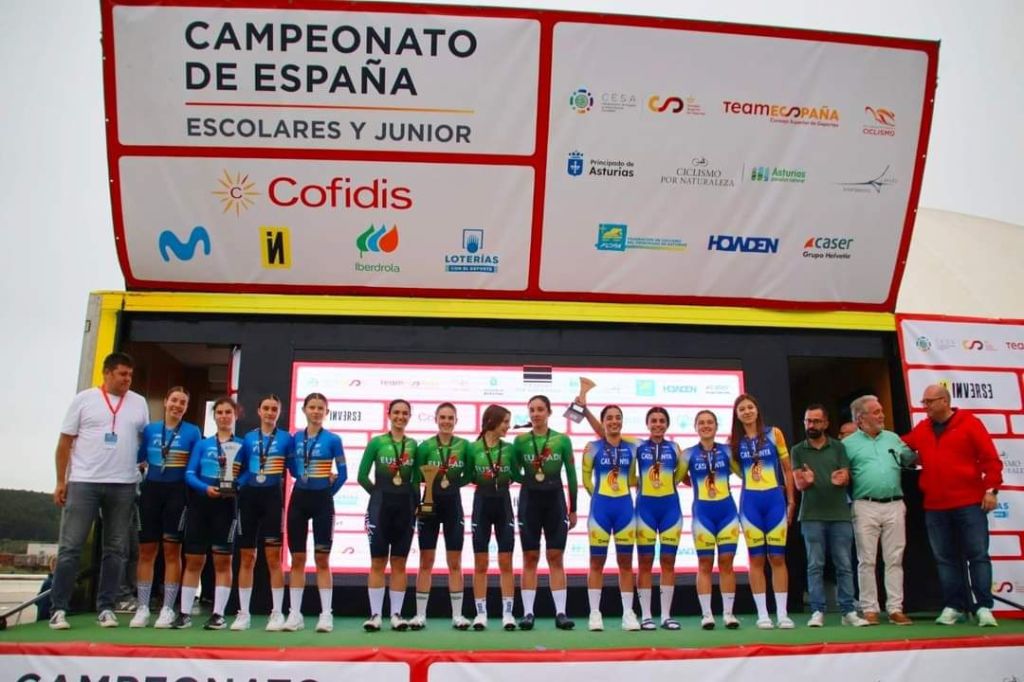 La Selección de la Comunidad Valenciana ha logrado esta mañana las dos primeras medallas del Campeonato de España Escolar y Júnior que ha comenzado hoy en Avilés. La Selección cadete masculina se han colgado el oro en la CRE. Óscar Morante, Asier Fortea, Jordi Peris y Pau Salvador han volado en la prueba contrarreloj. El combinado de Castilla y León ha terminado segunda y Euskadi ha completado el podio.