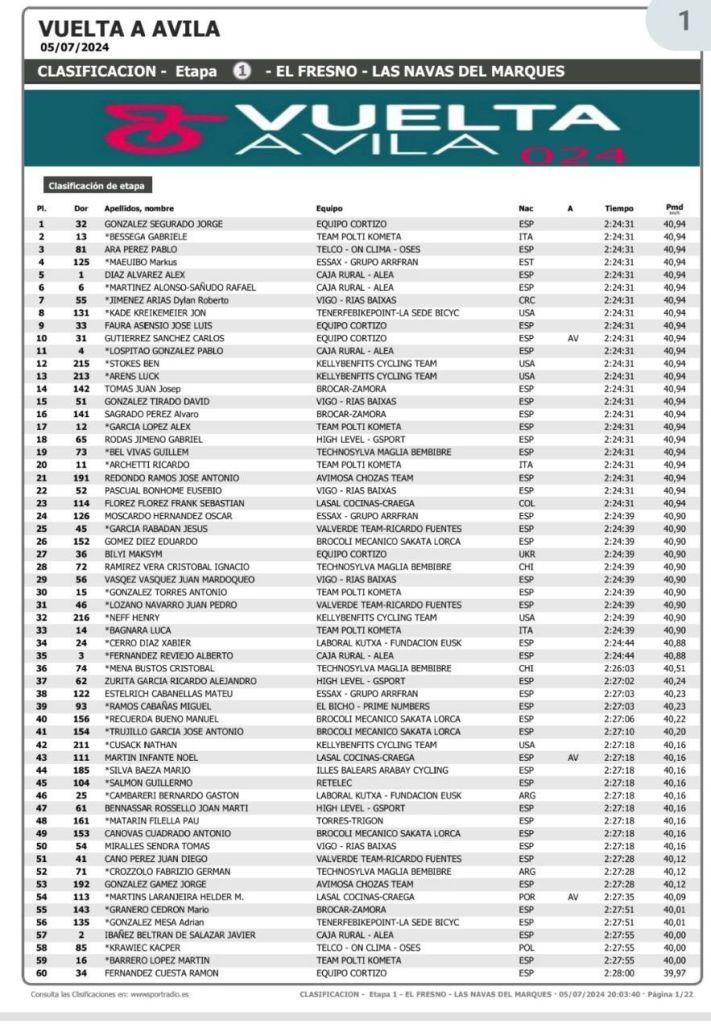 Jorge González (Padronés-Cortizo) se ha adjudicado al esprint la primera etapa con llegada a Las Navas del Marqués de la 48ª Vuelta Ciclista a Ávila. El asturiano, que se ha vestido de lider superaba en los últimos metros a Gabriele Bessega (Polti-Kometa) y a Pablo Ara ( Telco,m).