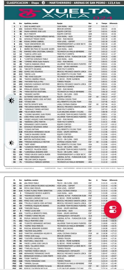 Álex Díaz (Filial Caja Rural Alea) se ha impuesto en solitario en la segunda etapa de la Vuelta a Ávila que ha finalizado en Arenas de San Pedro y se ha vestido de líder. A 36 segundos ha atravesado la línea de meta Álvaro Sagrado (Brocar Rali Alé), José Luis Faura (Cortizo) y Maksym Bilyi (Cortizo), por este orden.