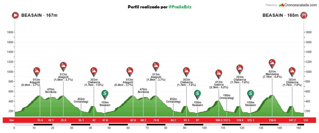 Un complicado recorrido espera a los ciclistas este domingo en Beasain, con 155 kilómetros caracterizados por los cuatro pasos por Atagoiti y otros tantos por el muro de Olaberria. La última y decisiva subida tendrá lugar a apenas seis kilómetros de meta, justo después de superar las rampas de Mandubia.