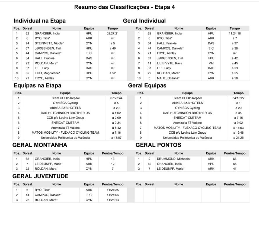 La Volta a Portugal Femenina de Cofidis tiene nueva dueña del maillot amarillo tras la disputa de la cuarta etapa. Se trata de la francesa India Grangier (Team Coop-Repsol), que atacó para ganar la clasificación de montaña y acabó ganando la etapa y situándose en lo más alto de la clasificación general.