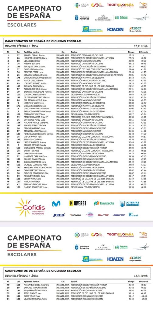 Emma Andreu (Cataluña) se ha proclamado campeona de España infantil de BTT en Avilés. Gisela Herrero (Castilla y León) y Noa Vega (Euskadi) le han acompañado en el podio. Ainhoa Cano (FCCV) ha terminado sexta. Erika M. Pérez (23), Naia Gasch (30) y Paula Barba (38) han completado la participación de la Comunidad.