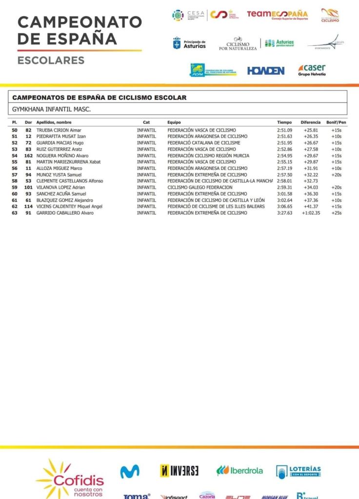 Nico Donat ha logrado la medalla de bronce para la Selección de la Comunidad Valenciana en la prueba de Gymkhana Infantil del Campeonato de España Escolar de Avilés. Manuel Fernández (Cantabria) ha sido el campeón y Bruno Cernuda (Asturias), segundo. Por Selecciones, la FCCV ha finalizado tercera. José Manuel Perales ha sido décimo; Arnau Bort ha ocupado el puesto 34; y Nicolás García, el 36;