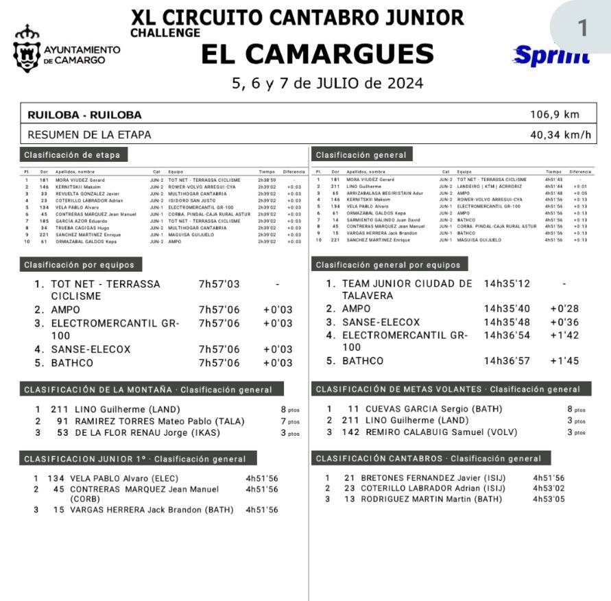 Gerad Mora (Tot Net) se ha impuesto hoy en la segunda etapa del XL Circuito Cántabro Júnior «El Camargués» con salida y meta en Ruiloba y 106 kilómetros de recorrido. Maksim Kernitskii (Rower) ha sido segundo y Javier Revuelta (Multihogar), tercero. Oleg Melnikov (Bonillo Team) se ha quedado sin premio en la misma recta de meta. De cara a a la pancarta, con el pelotón pisando los talones, iba escapado con otros dos ciclistas, y se han ido al suelo ya que el suelo estaba resbaladizo. El grupo los ha rebasado y Mora se ha llevado el triunfo y se ha vestido de amarillo. Gran carrera de Oleg, que ha superado en esta jornada la montaña con los mejores.