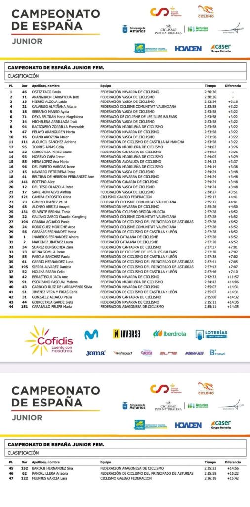 Aitana Calabuig roza el podio en el Campeonato de España Júnior de la categoría júnior que se está disputando en Avilés. La corredora de la FCCV ha finalizado cuarta. Victoria de Paula Ostiz. La navarra ha superado al sprint a una gran Irati Aranguren (Euskadi). Laida Hierro (Euskadi) termina tercera.