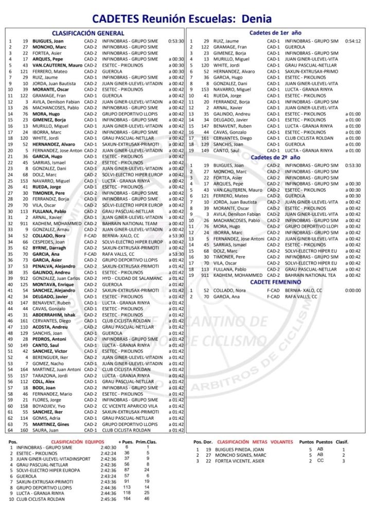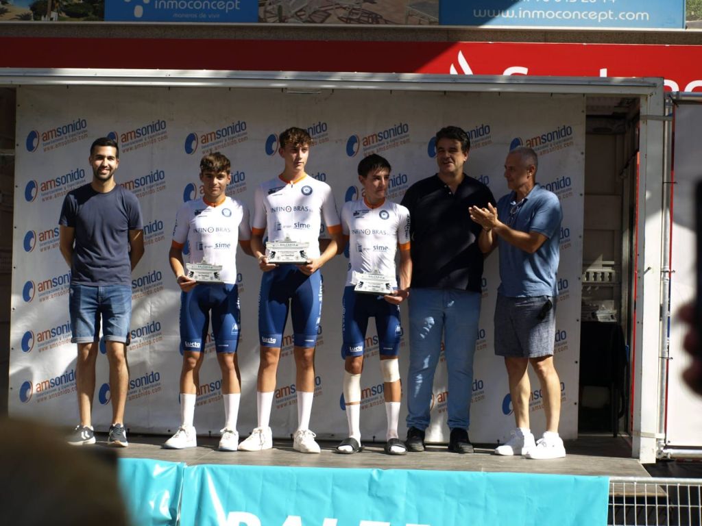 Joan Buigues (Infinobras Grupo Sime) se ha impuesto hoy el Dénia en el XLVI Trofeo Stm. Sangre-Trofeo Balearia de Escuelas de Ciclismo de la categoría cadete. Ha estado acompañado en el podio por sus compañeros de escuadra Marc Moncho y Asier Fortea. Los tres han entrado juntos en meta. Pepe Arqués, también del Infinobras Grupo Sime, ha terminado cuarto. Por escuadras, la escuadra de Alfaz del Pí ha sido la primera. En féminas, triunfo de Nora Collado (Bernia Xaló). Joan Buigues también se ha llevado las Metas Volantes.