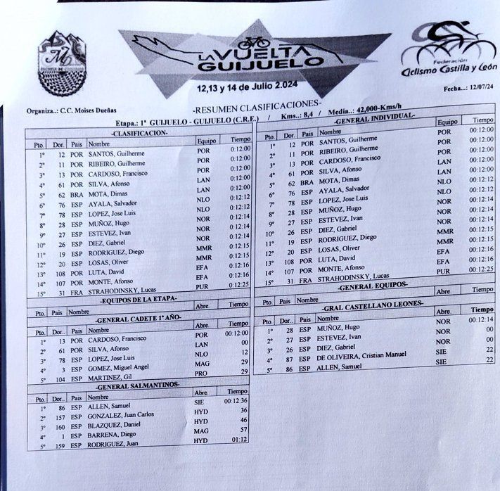 La Selección de Portugal (12:00:01) se ha impuesto en la CRE inicial de la Vuelta Ciclista a Guijuelo disputada hoy sobre una distancia de 8.2 kilómetros. El triunfo se ha decidido por 81 milésimas. El Landeiro KTM (12:00:82) y El Nieto del Lobo Nutriban (12:12:2) han completado el podio. Puesto 14 para el Ikaskola-TX.AEL que ha competido con Alberto Manzano, Marcos Sánchez, Hugo Arnalte, Sergi Ribera y Hugo Melero.