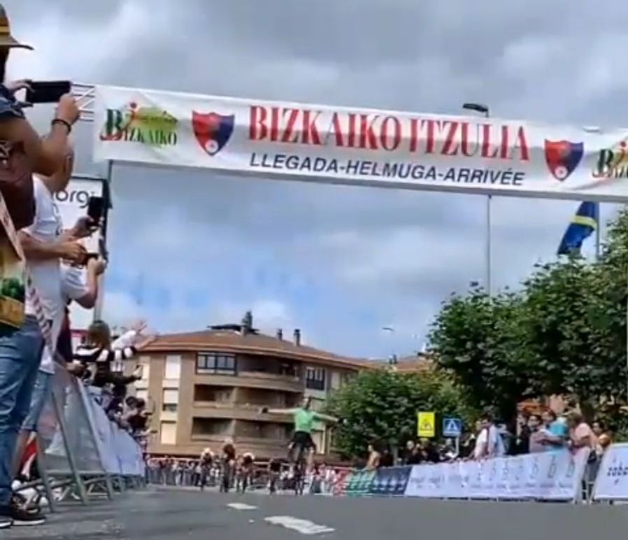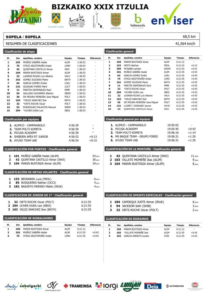 Hodei Muñoz (Alimco Campagnolo) se impone en el primer sector de la tercera etapa de la Bizkaiko Itzulia Júnior disputado esta mañanas en Sopela. Puesto 13 de Óscar Orts (Polti Kometa), que lidera la clasificación de los jóvenes. Aimar Marín (Alimco-Campagnolo) sigue al frente de la general .