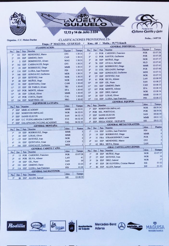 La última etapa de la IV Vuelta Ciclista a Guijuelo Cadete se la llevó Marco Menéndez, seguido de Darío Gimeno y tercero fue el local Álvaro Dominguez. Tras esta etapa el triunfo final fue para el portugués Francisco Cardoso, segundo se ha clasificado Guillerme Santos y tercero acabó Hugo Muñoz. Las metas volantes fueron para Juan Francisco Llera, la montaña para Diego Rodríguez, el maillot de mejor salmantino para Samuel Allen, el de mejor castellano y leonés Hugo Muñoz, el de mejor cadete de primer año se lo adjudicó Francisco Cardoso y el premio al mejor equipo lo ganó el Norinver Impalag.