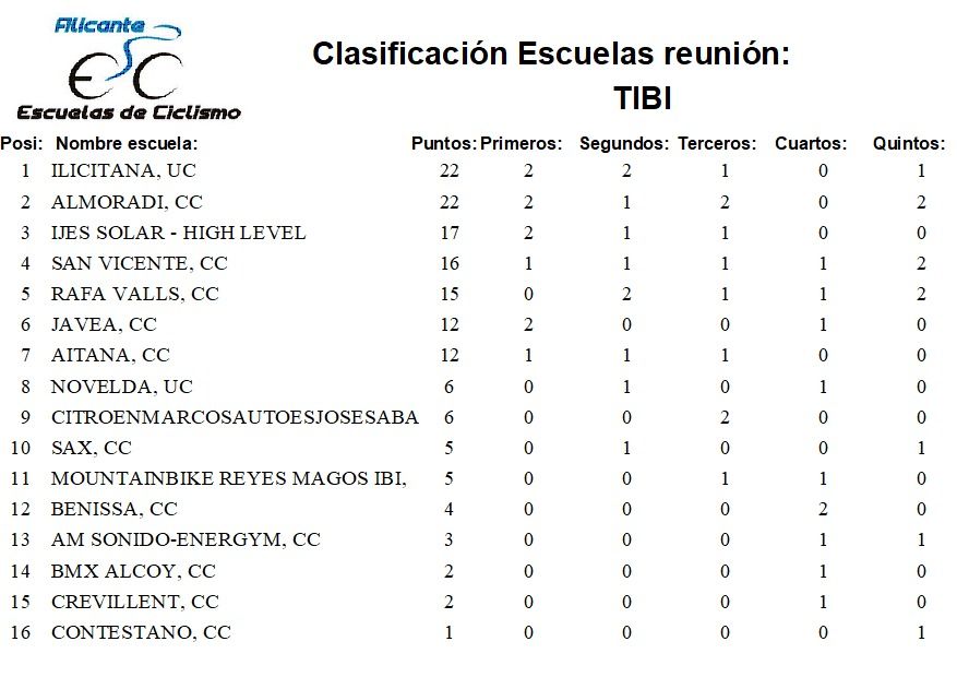 La Unión Ciclista Ilicitana se ha impuesto esta mañana en Tibi por el «puestómetro» al CC Almoradí en el VI Trofeo de Escuelas AM Sonido-Riber. Ambos han sumado 22 puntos por los 17 del Ijes Solar High Level, que ha sido tercero.