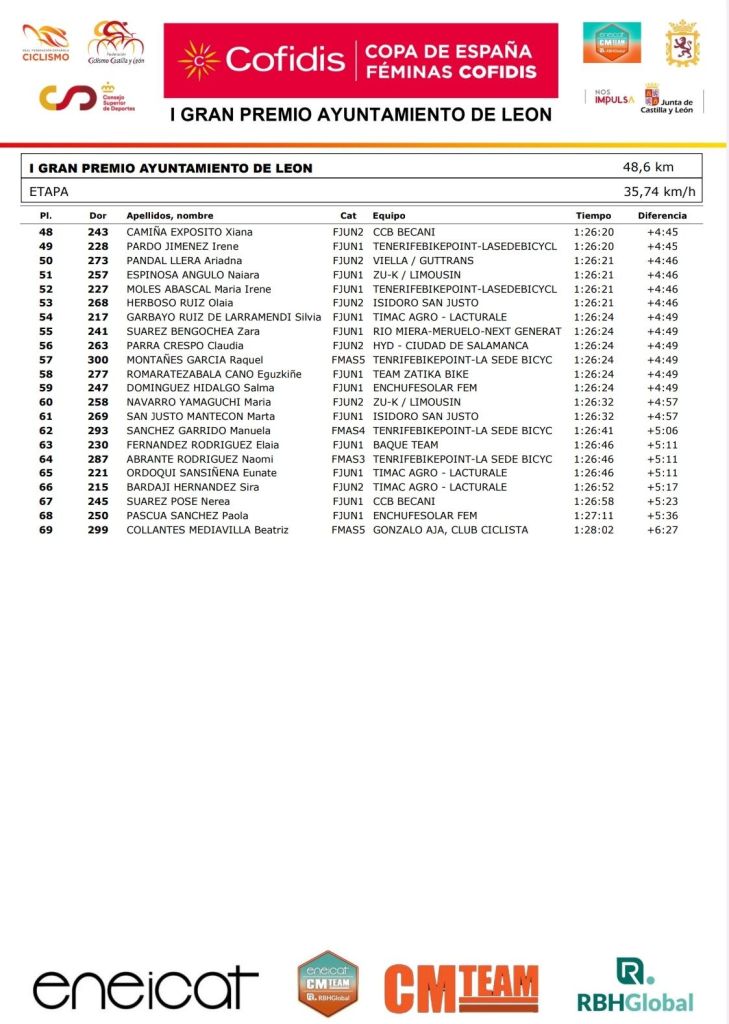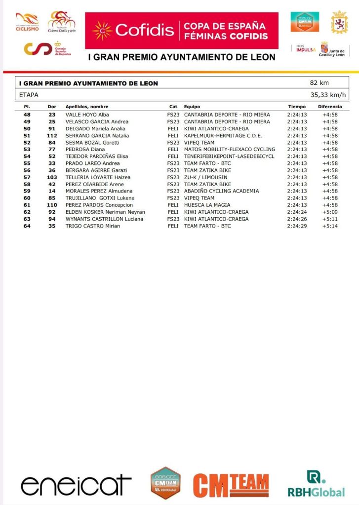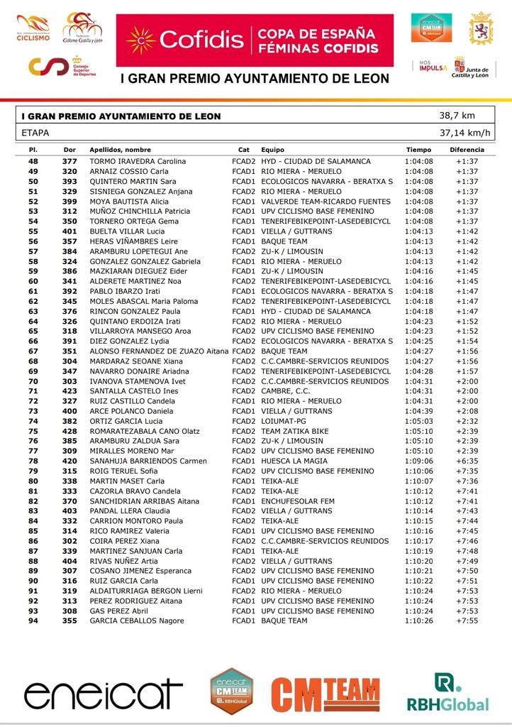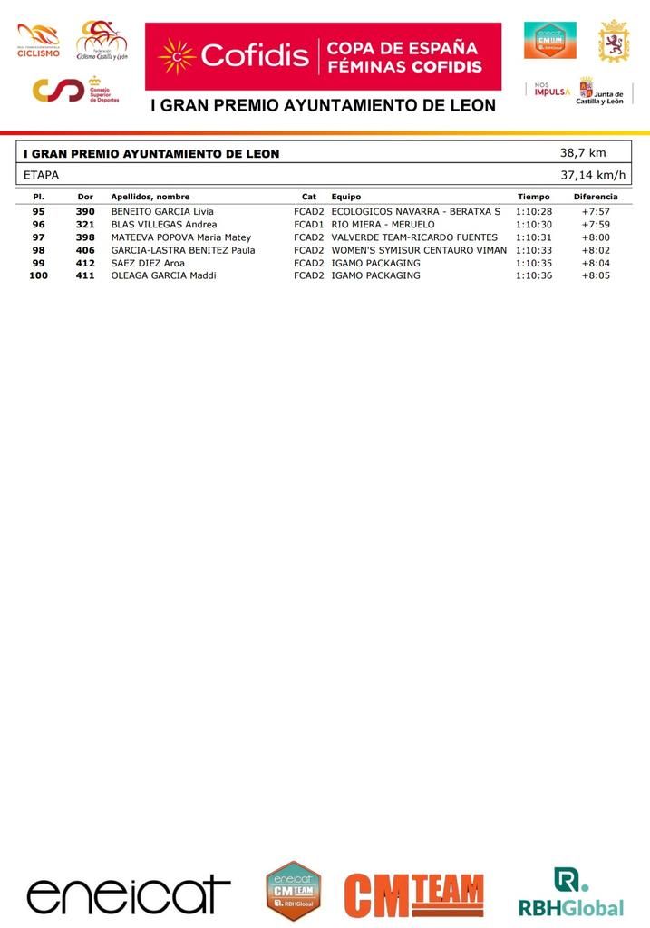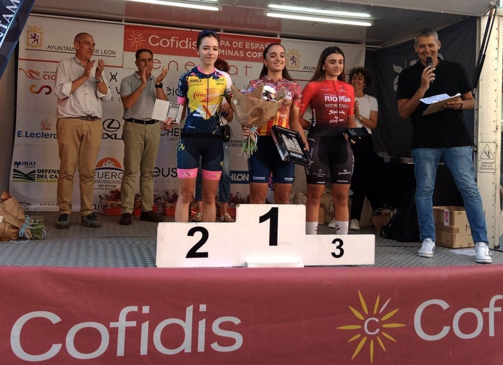 Triunfo de Valentina Basilico en el GP Ayuntamiento de León. La ciclista del Eneicat-CMTeam ha sido la más rápida en el sprint entre el reducido pelotón cabecero. Paula Blasi entra segunda y Susana Pérez Conejero, tercera, se proclama campeona de la Copa de España Féminas Cofidis.