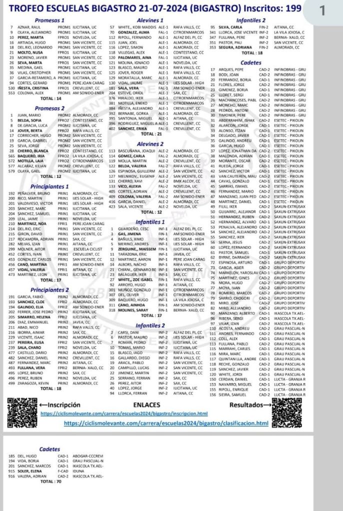 Llegan como líderes de la Challenge de Escuelas de Alicante a Bigastro Vera Sala (AM Sonido) y Jaume Vidal (Ijes Solar), en Alevines 1; Valeria Coloma (AM Sonido) y Eugenif Melnikov (San Vicente), en Alevines 2; Valeria Vidal (Aitana) y Marc Sánchez (UC Ilicitana), en Principiantes 1; Elía Galindo (AM Sonido) y Marc Fernández (Aitana), en Principiantes 2; Nusa Moltó (UC Ilicitana) y Raúl Aznar (UC Ilicitana), en Promesas 1; Sofía Belda (Contestano) y Gael Olaya (UC Ilicitana), en Promesas 2; Jimena Gas (AM Sonido) y Ximo Bañuls (Ijes Solar), en Infantiles 1; y Adriana Segura y Nicolás García (CC Rafa Valls), en Infantiles 2.