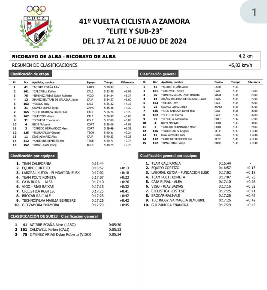 Aitor Agirre (Laboral Kutxa) se ha impuesto en el prólogo de la Vuelta Ciclista a Zamora disputada en Ricobayo de Alba, una CRI de 4.2 kilómetros. Kellen Caldwell (California) y Dylan Jiménez (Rias Baixas) han completado el podio. Cuarta plaza para Javier Ibáñez (Filial Caja Rural Alea). Puesto 15 para Josep Tomàs (Brocar Rali Alé).