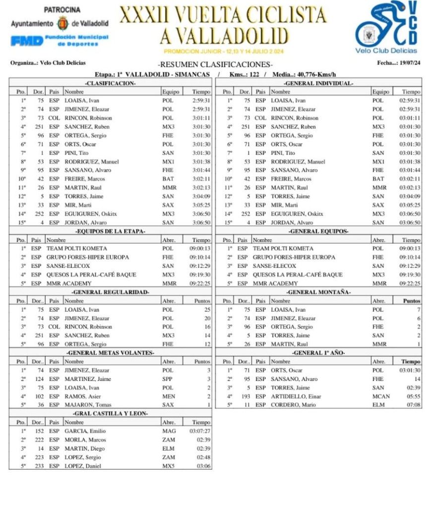 Iván Loaisa (Team Polti Kometa) se ha impuesto en la primera etapa de la Vuelta a Valladolid Júnior 2024 que ha unido a Campo Grande y Archivo de Simancas, tras 121.9 kilómetros de recorrido. Ha entrado en meta junto a su compañero de escuadra Eleazar Jiménez. Robinson Rincón, tercero, ha completado la exhibición del Polti. Sexta plaza de Óscar Orts, líder de los júniors de primer año.