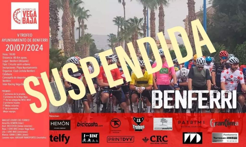 El V Trofeo Ayuntamiento de Benferri previsto para el sábado ha quedado suspendido por las altas temperaturas. En principio, la organización decidió retrasar la salida a las 19 horas. Pero se ha recibido un escrito de Conselleria advirtiendo que podría suspenderla a lo largo del sábado si se decreta el nivel de preemergencia 3 por el riesgo de incendios. Ante esta situación se ha optado por anular la carrera con la idea de evitar que los participantes se desplacen y luego no puedan correr.