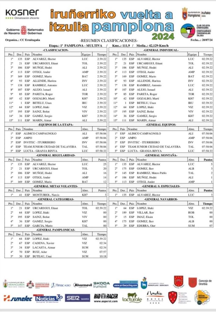 Héctor Álvarez (Lucta Granja Rinya) ha dado una auténtica exhibición en la primera etapa de la Vuelta a Pamplona que ha partido de la capital navarra y ha finalizado en Mutilva. El alicantino ha estado escapado y eso le ha permitido sumar los puntos para líderar la montaña y los Sprints Especiales. Y, después, cuando lo ha atrapado el pelotón, ha sido capaz de levantar los brazos como vencedor en la línea de meta y vestirse con el maillot de líder de la General. ¡Espectacular!. Séptima plaza para Antonio Ramírez (Lucta-Granja Rinya).