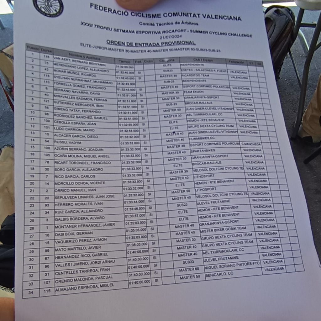 Van Aert logra la primera posición como élite; Alejandro Merenciano se ha impuesto entre los Sub 23; Monar, entra el primero de los M30; Francisco Torrella, de los M40; y Fernando Gimeno, de los M50.
