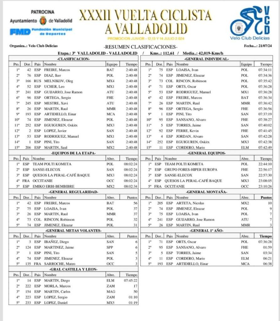 Marcos Freire ( Bathco) ha vuelto a ganar en la capital pucelana en la jornada final de la Vuelta Ciclista a Valladolid. Iker Díaz (Polti) ha terminado segundo y Oleg Melnikov (Lucta-Bonillo Team), tercero, a pesar de entrar con la bicicleta rota (Manillar y cambio deteriorados) por una caída que ha sufrido a 8 kilómetros de meta. Top 10 de José Ramón Guijarro (Ayuso Team) y Xavi Mestre (Ayuso Team).