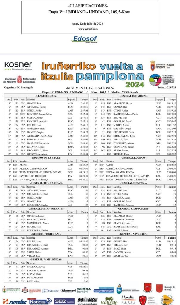 Iker Gómez (Quesos Albéniz) se ha adjudicado la etapa reina de la Vuelta Ciclista a Pamplona Júnior que ha tenido inicio y fin en Undiano y 109.5 kilómetros de recorrido. Héctor Álvarez (Lucta-Granja Rinya) ha entrado segundo y ha recuperado el liderato a falta de la última jornada. Antonio Ramírez (Lucta-Granja Rinya) ha terminado sexto.