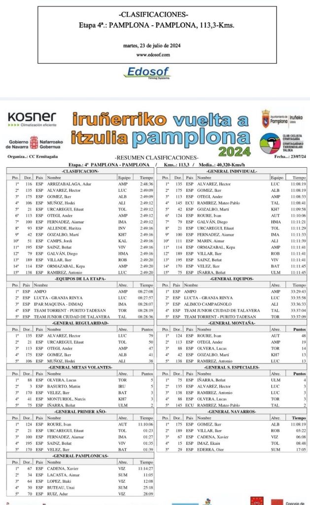 El benidormense Héctor Álvarez (Lucta-Granja Rinya) se ha adjudicado la Vuelta Ciclista a Pamplona Júnior tras la disputa de la cuarta y última jornada de la ronda con salida y meta en la capital navarra. Hoy ha sido segundo en la rampa de El Redín, por detrás de Adur Arrizabalaga (GoierrikoTB) que ha llegado en solitario. «Ha sido un triunfo de equipo. Gracias a mis compañeros. Al final, tenía que ganar por ellos «, confesaba el benidormense en meta que ya tiene puesta su mirada en el Europeo.