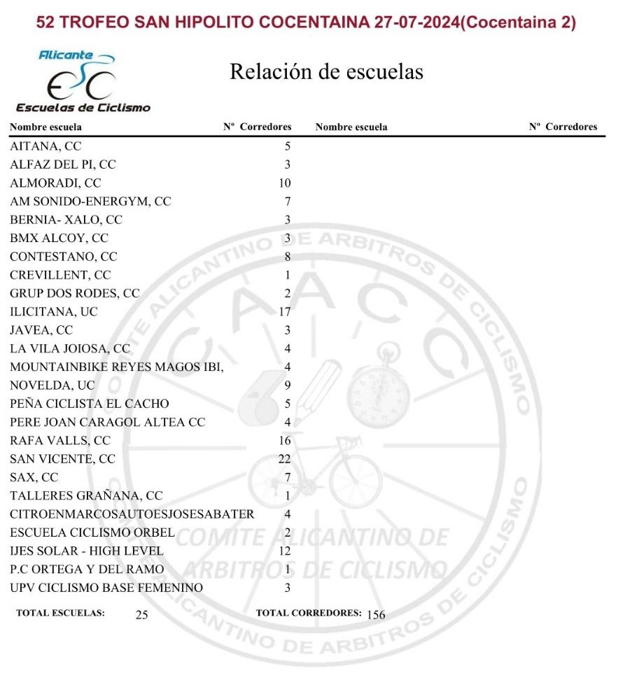 El sábado, día 27 de julio, se disputa en Cocentaina el 52 Trofeo de Ciclismo San Hipólito para corredores Cadetes y Escuelas. La competición de los primeros comenzará a las 9.30 horas en la calle Almudaina, que coincidirá con las Gymkhana de los más pequeños. Luis Cayuela (El Nieto del Lobo) fue el ganador de la edición de 2023 por delante de los corredores del Juan Giner-Ulevel-Vitaldins Pau Salvador y Xavi Mestre, segundo y tercer clasificado, respectivamente. Candela Cazorla fue la mejor cadete femenina.