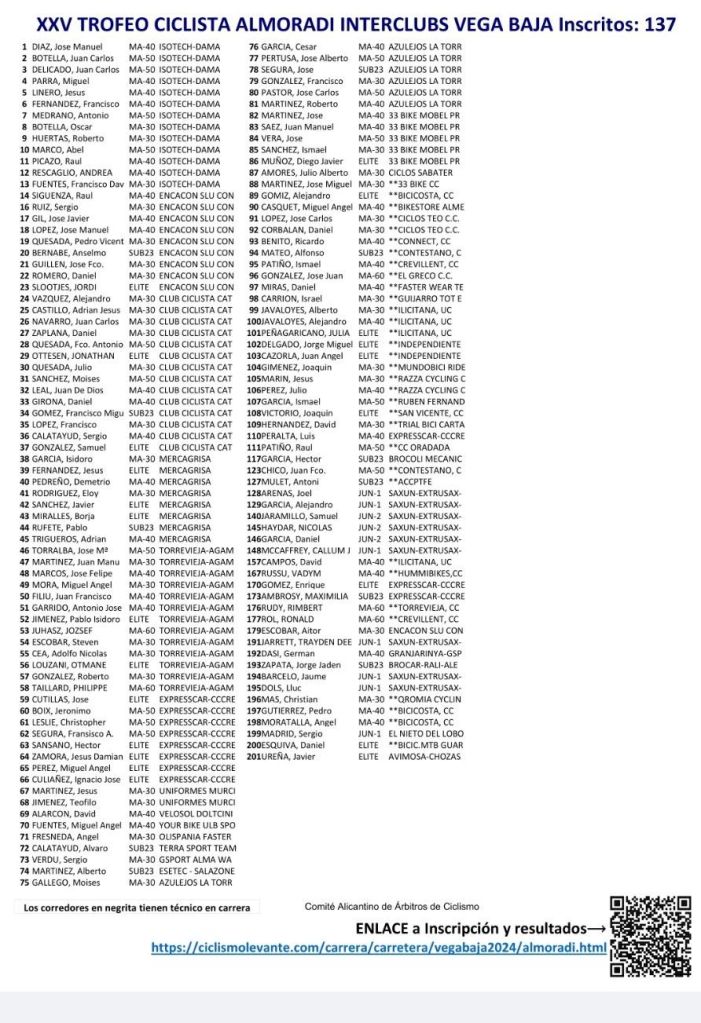 A partir de las diez horas tendrá protagonismo el Interclub Vega Baja. El pelotón deberá recorrer 75 kilómetros. Será la última carrera del Torneo que lidera José Manuel Díaz Fenoll (Isotech Suministros Dama). El Encacon SLU es el mejor equipo; Alejandro Gómiz domina las Metas Volantes y Julio Alberto Amores, la Montaña. Además, Alejandro Gómiz (BiciCosta) comanda la general de la categoría élite; Anselmo Bernabé (Encacon SLU) es el mejor Sub 23; Julio Quesada (Catral-Telfy) lidera a los M30; José Manuel Díaz Fenoll, a los M40; Francisco Antonio Quesada (Catral-Telfy), en M50; y Jozsef Juhasz (Torrevieja), en M60. En total son 137 los inscritos para la última prueba del Interclub.