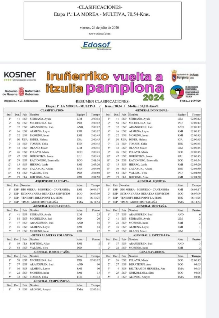 Ayala Serrano (Oriakotxe) ha sido la ganadora de la primera etapa de la Vuelta a Pamplona Femenina Júnior que ha comenzado en la capital navarra y finalizado en Mutilva tras 70,54 kilómetros de recorrido. Ha sido la más rápida de las cuatro corredoras que han llegado en solitario a meta. Irati Michelena ha entrado segunda; Irati Aranguren (Andoiango), tercera; y la valenciana Leyre Almena (Río Miera-Meruelo), cuarta. Irene Moreno (Río Miera-Meruelo), quinta, ha atravesado la línea de meta a 33 segundos. Puesto 13 para Aitana Calabuig (Tenerife); 14, de Vera Valero (UPV); 24, Claudia Xiangfeng (Tenerife); y 26, Aroa Rodríguez (UPV).