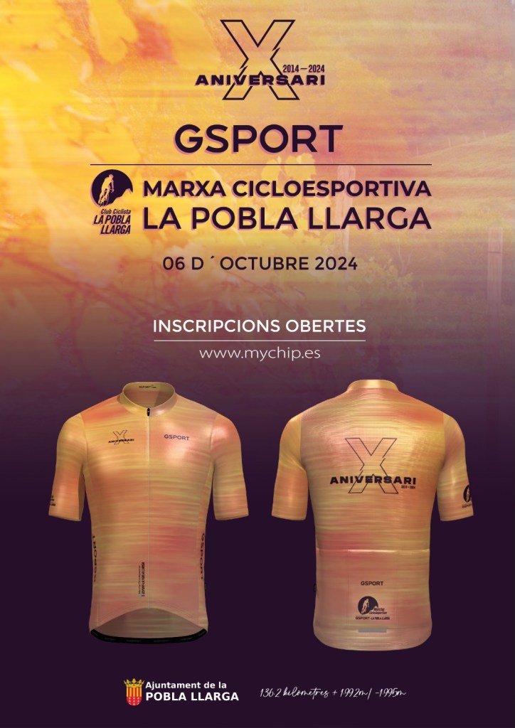 Ya se conoce el maillot que vestirán los participantes de la X Marcha Gsport-La Pobla Llarga que se disputará el próximo 6 de octubre. Los beneficios de la prueba son utilizados para fomentar el ciclismo base. El coste de la inscripción para los participantes, incluyendo el maillot de regalo, el dorsal con chip, la comida final y todos los servicios de la marcha es de: