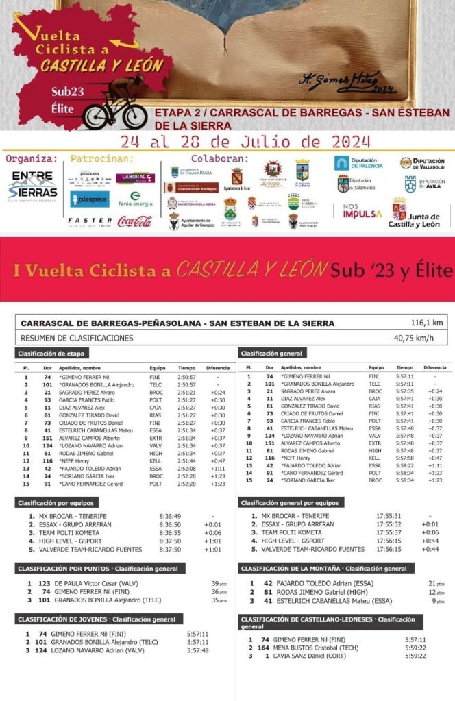 Nil Gimeno (Equipo Finisher) ha sido el ganador de la segunda etapa de la Vuelta Ciclista a Castilla y León para corredores élite y sub 23 que ha finalizado en San Esteban de la Sierra, tras 116’1 kilómetros de recorrido. Ha superado a su compañero de fuga: Alejandro Granados (Telco ON). Álvaro Sagrado (Brocar Rali Alé) ha entrado tercero a 24 segundos. A medio minuto cruzaba la meta un pequeño grupo con Pablo García, Alex Díaz, David González y Daniel Criado. Una avería ha dejado sin opciones a Gabriel Rojas (High Level-Gsport). Gimeno se ha vestido de líder, con Sagrado tercero.