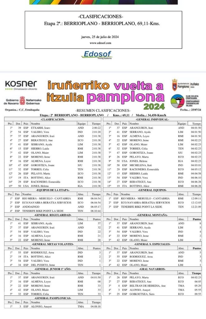 Izaro Etxarri (Andoaingo) se ha impuesto en la segunta etapa de la Vuelta a Pamplona Júnior Femenina con principio y fin en Berrioplano, de 69,11 kilómetros de recorrido. A 58 segundos ha entrado Vera Valero (UPV), mientras que Irati Aranguren (Andoaingo), tercera, ha dado tiempo a un grupo en el que iba Leyre Almena (Río Miera), que ha terminado novena. Puestos 22 y 23 para las corredoras del Tenerife Aitana Calabuig y Claudia Xiangfeng.