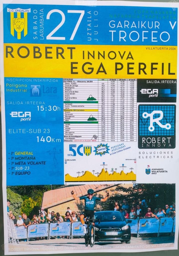 El sábado, 27 julio, se disputa el V Trofeo Electricidad Robert Innova de Villatuerta para corredores élite y sub 23. El CC Ondalan ha preparado un recorrido de 140 kilómetros de un trazado que, especialmente, en la segunda mitad de la jornada, no contará con un solo momento de respiro.