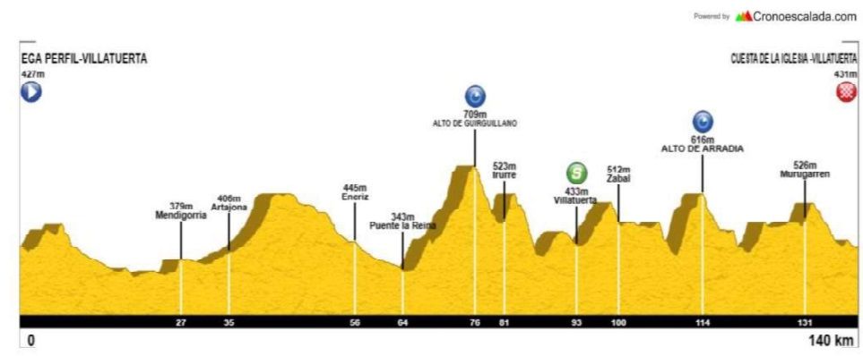 La carrera navarra tomará la salida en el Polígono Industrial de Villatuerta (EGA Perfil) a las 15:30 horas, mientras que la llegada se estima cerca de las 19 en esa ya tradicional Cuesta de la Iglesia de San Veremundo en la localidad de Tierra Estella.