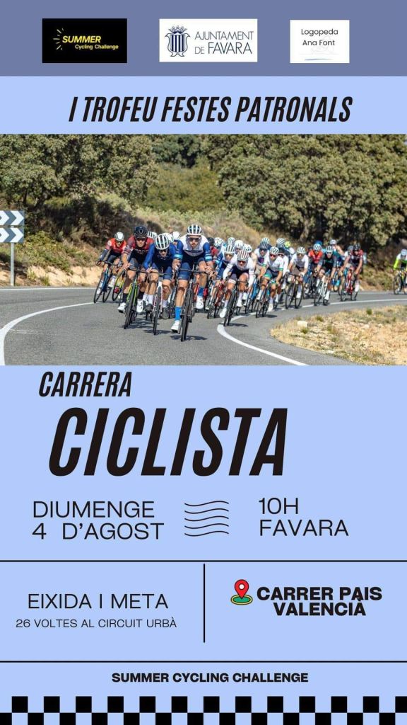 El domingo, día 4 de agosto, se disputa en Favara, la quinta prueba de la Summer Cycling Challenge. La salida será a las 10 horas. Al frente de la clasificación general llega Ferrán Miravalles (Granja Rinya). Iván Orrico (Hemon) es el primer élite y comanda las Metas Volantes y Sprints Especiales; Alejandro Merenciano (Esetec) domina en Sub 23; Miravalles, en M30; Vicente Morcillo (Lithosport), en M40; y Fernando Gimeno (Juan Giner), en M50.