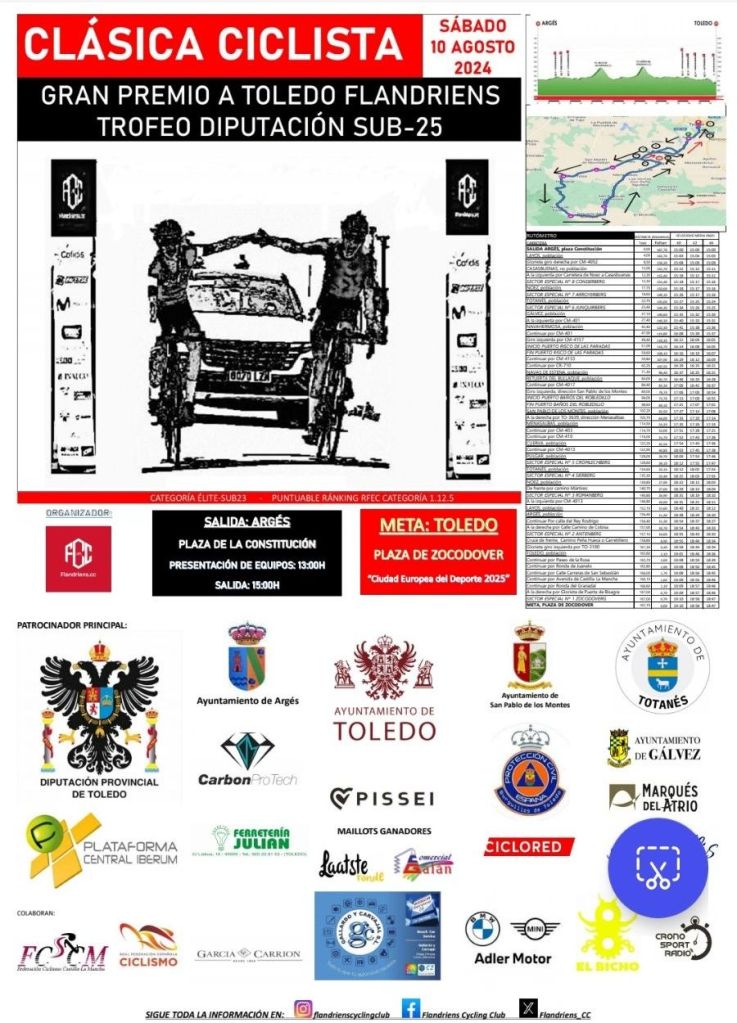 El I Gran Premio Vuelta Ciclista a Toledo Flandriens, que se disputará el sábado 10 de agosto entre Argés y Toledo, lleva en su esencia todo el aroma de las clásicas del norte de Europa. Serán 168 kilómetros de recorrido con 2100 metros de desnivel por las carreteras de las provincias de Roledo y Ciudad Real. Los 160 ciclistas de categoría sub-25 se encontrarán con muros de hormigón, carreteras estrechas, puertos de montaña y un final en subida con dos tramos de adoquines para terminar en la plaza de Zocodover. Se cambiará el frío y la lluvia del norte de Europa por el calor toledano, que terminará sobre las 19:00 horas de la tarde que cruzará el primero la gran meta de Zocodover, pero también yn «Flandrien» que será el ciclista que más pelee durante los 168km del Gran Premio.