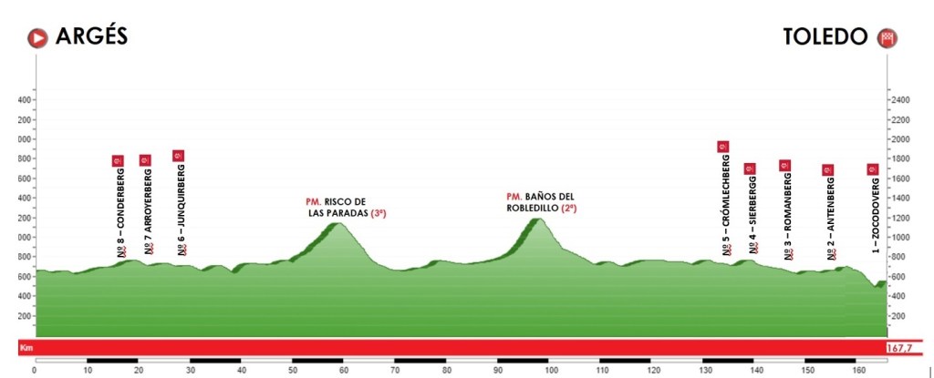 La carrera saldrá a las 15:00 horas desde Argés y tendrá dos puertos de montaña. El Risco de las Paradas, de tercera categoría, que se coronará, en el km. 60 de la etapa, y el Alto de los Baños del Robledillo (el Alpe d`Huez de la Mancha) con sus curvas de herradura. Un puerto de segunda categoría complicado que romperá el grupo en el km 100 de carrera, pero con todavía 70 hasta la meta en la capital manchega.