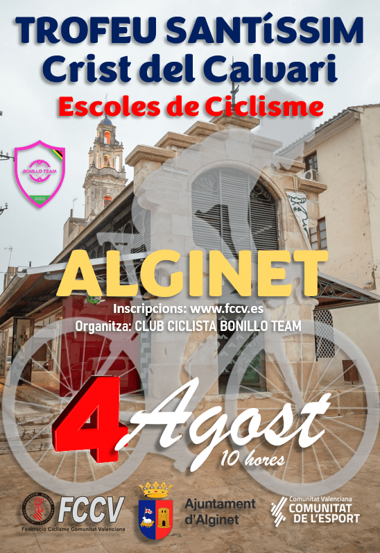 Alginet acoge el domingo, 4 de agosto, el Trofeu Santíssim Crist del Calvari de Escoles de Ciclisme. La prueba, puntuable para la Challenge de Escuelas de València, está organizada por el Bonillo Team y comienza a las 10 horas. Se ha diseñado un circuito de 1.002,29 metros. Antes, los escolares tendrán una cita el viernes, 2 de agosto, en Paiporta.