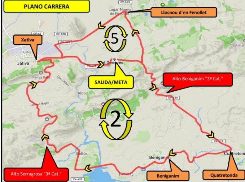 El pelotón comenzará a rodar a las 9:30h en la avenida Gandía de la localidad de Genovés. El recorrido es de 116 kilómetros y consta de 5 vueltas a un circuito pequeño entre las localidades de Genovés, Xàtiva y Llocnou d’en Fenollet; y 2 vueltas a uno grande por el paso del Alto de Benigànim y el Alto Serragrosa, ambos de 3º categoría, pasando por las localidades de Quatretonda, Benigànim, Bellús, Xàtiva y Genovés. Inscritos