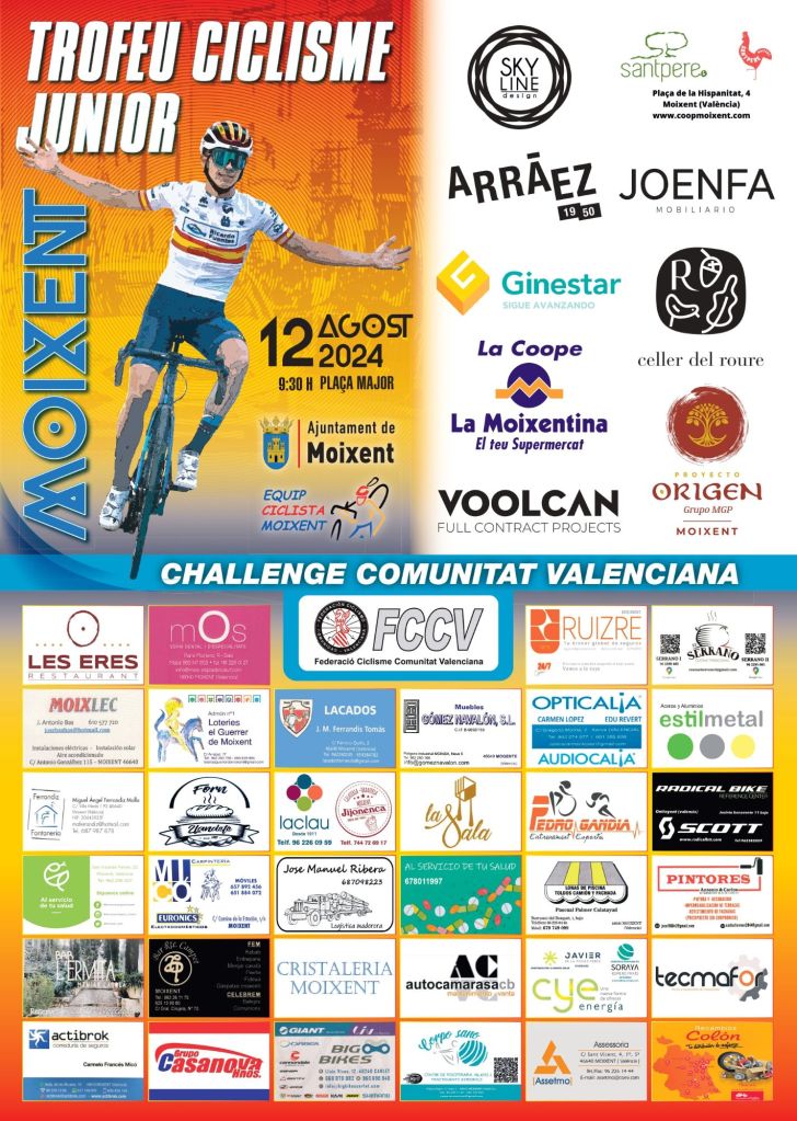 El 𝗧𝗿𝗼𝗳𝗲𝘂 𝗱𝗲 𝗖𝗶𝗰𝗹𝗶𝘀𝗺𝗲 𝗝ú𝗻𝗶𝗼𝗿 regresa a Moixent hoy, día 12 de agosto, con un exigente y técnico recorrido entre la Font de la Figuera y Navalón. Serán casi 1.400 metros de desnivel y una buena participación. A las 9:30 horas se dará el banderazo de salida de la última prueba puntuable para la Challenge Junior de la Comunitat.