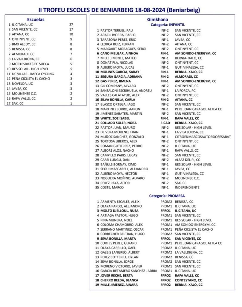 A nivel individual, Nicolás Donat (Ontinyent) y Adriana Segura (Almoradí) se han impuesto en Infantiles 2; Ximo Bañuls (Ijes Solar) y Saray Molines (Bernia Xaló), en Infantiles 1; Adrián García Retamero (UC Ilicitana) y Nusa Moltó (UC Ilicitana), en Promesas 1; Albert Galbis (La Valldigna) y Blanca Cherro (Contestano), en Promesas 2; Izán Mejías (Aitana) y Valeria Vidal (Aitana), en Principiantes 1; Marc Donet (Mortesbikes) y Vera Fullana (Bernia Xaló), en Principiantes 2; Kobi Maddis White (Rafa Valls) y Aina Palomares (UC Ilicitana), en Alevines 1; y Xavi Cherro (BMX Alcoy) y Valeria Coloma (AM Sonido), en Alevines 2. Nora Collado (Bernia-Xaló) ha sido la mejor cadete.