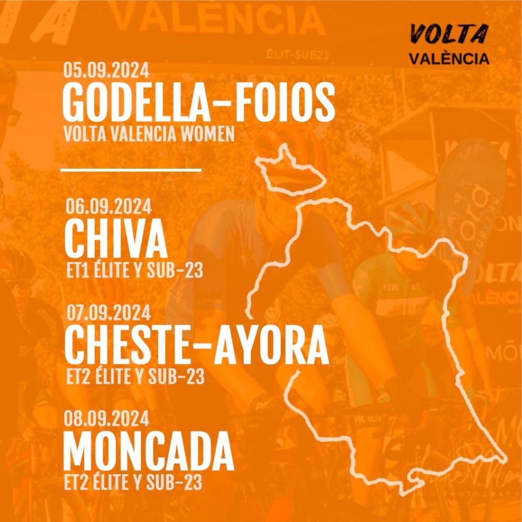 En cuanto a la Volta a València élite y sub-23 masculina, la prueba mantiene sus tres etapas del 6 al 8 de septiembre. El inicio en esta ocasión tendrá como sede la localidad de Chiva, que acogerá la salida y meta de la primera jornada. Para la segunda etapa, el pelotón se desplazará desde Cheste hasta la localidad de Ayora, que ya acogió la meta final de la Volta a València 2023. El fin de fiesta será el domingo 8 de septiembre en Moncada, toda una sede histórica de la competición que busca el sucesor de Adrien Maire (AVC Aix en Provence).
