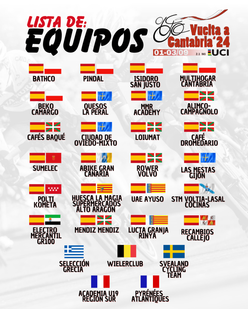 La Vuelta a Cantabria júnior internacional, que se disputa del 1 al 3 de septiembre, ha confirmado los 29 equipos que participarán en la prueba. Un total de 24 escuadras nacionales y 6 internacionales que buscarán la victoria final y entre las que se encuentran el Lucta-Granja Rinya y UAE Ayuso Team