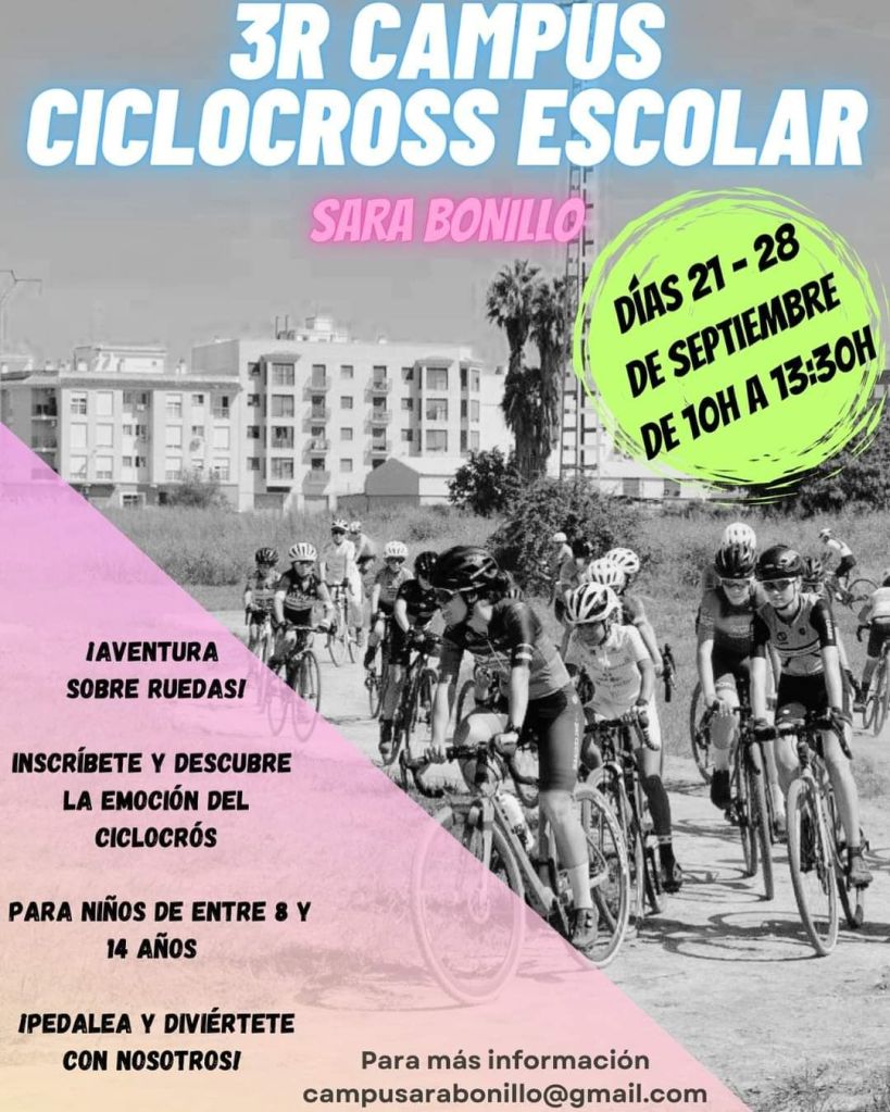 El tercer Campus Sara Bonillo de Ciclocross Escolar tendrá lugar los días 21 y 28 de septiembre en el circuito permanente de Sueca. Va dirigido a niños entre 8 y 14 años. Se realizará en horario de 10 a 13.30 horas. Las inscripciones ya están abiertas.