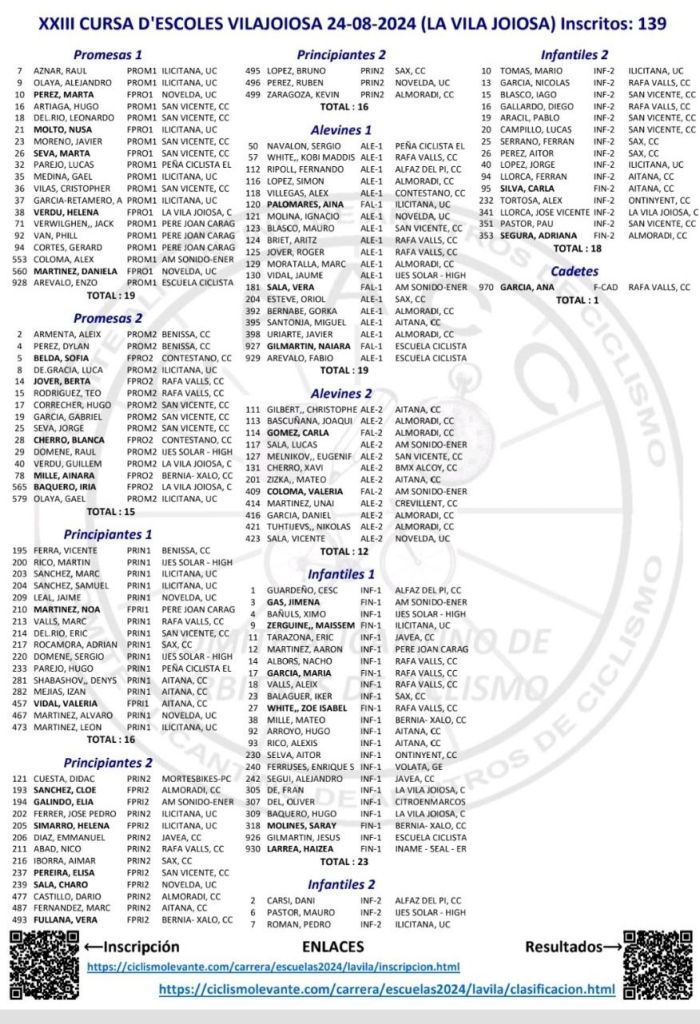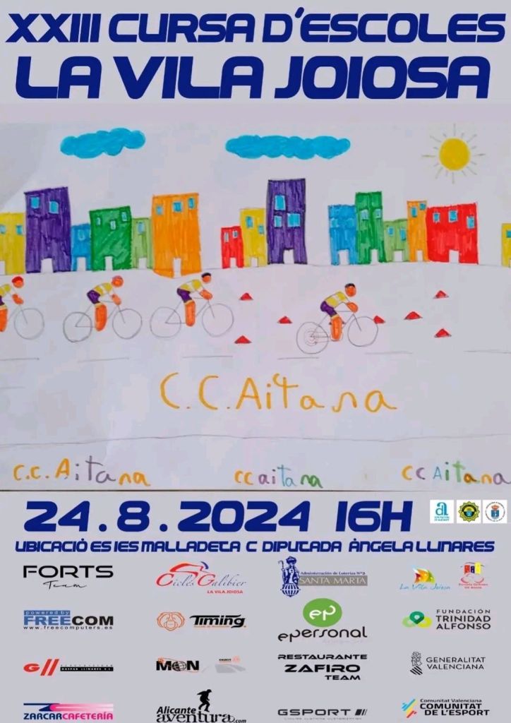 El sábado, día 24 de agosto, se disputa la XXIII Cursa d’Ecoles La Vila Joiosa, prueba puntuable para la Challenge de Escuelas de Ciclismo de la provincia de Alicante. La prueba comenzará a las 16 horas y se desarrollará en el entorno del IES Malladeca, en la calle diputada Ángel Llinares. La competición está organizada por el CC Aitana y el cartel anunciador de la prueba ha sido diseñado por Mateo Zizka, Alevín de segundo año, de la escuela del club vilero. Se presentaron una serie de dibujos y los padres eligieron al de Zizka.