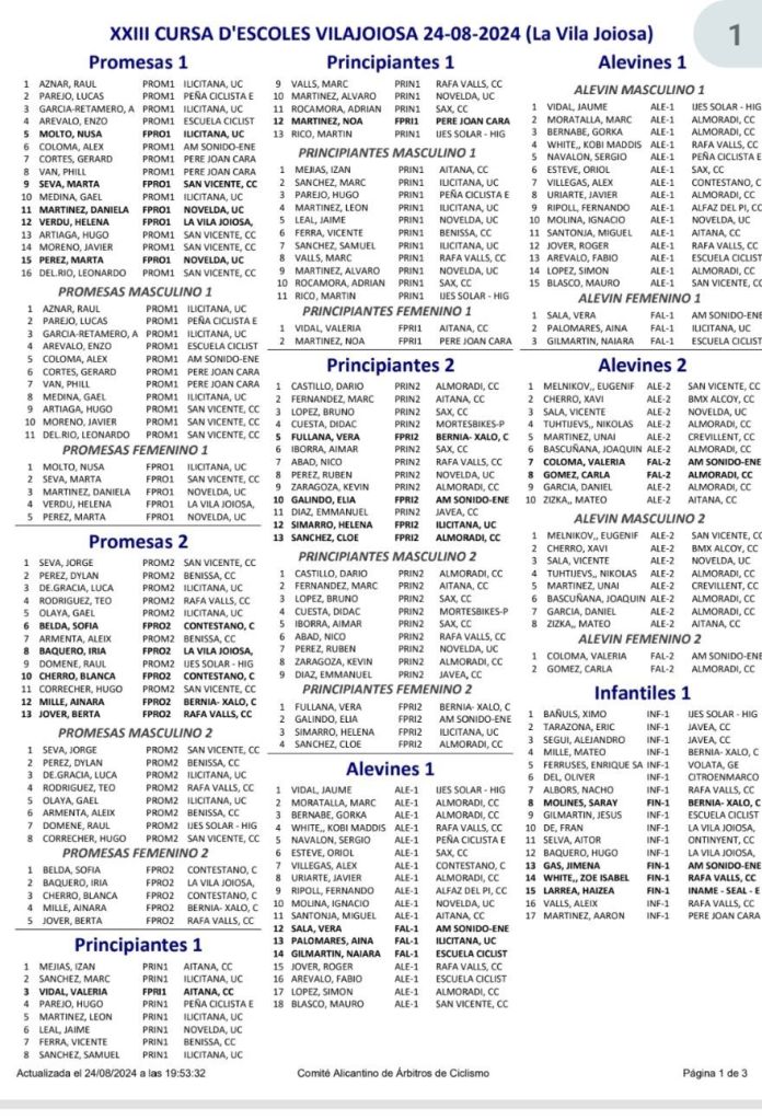 Además, Raúl Aznar (UC Ilicitana) y Nusa Moltó (UC Ilicitana) se han impuesto en Promesas 1; Jorge Seva (San Vicente) y Sofía Belda (CC Contestano), en Promesas 2; Izán Mejías (Aitana) y Valeria Vidal (Aitana), en Principiantes 1; Darío Castillo (Almoradí) y Vera Fullana (Bernia Xaló), en Principiantes 2; Jaume Vidal (Ijes Solar-High level) y Vera Fullana (AM Sonido), en Alevines 1; Eugenif Melnikov (San Vicente) y Valeria Coloma (AM Sonido), en Alevines 2; Ximo Bañuls (Ijes Solar-High level) y Saray Molines (Bernia Xaló), en Infantiles 1; Nicolás García (Rafa Valls) y Adriana Segura (Almoradí), en Infantiles 2, y Ana García (Rafa Valls), en Cadetes.