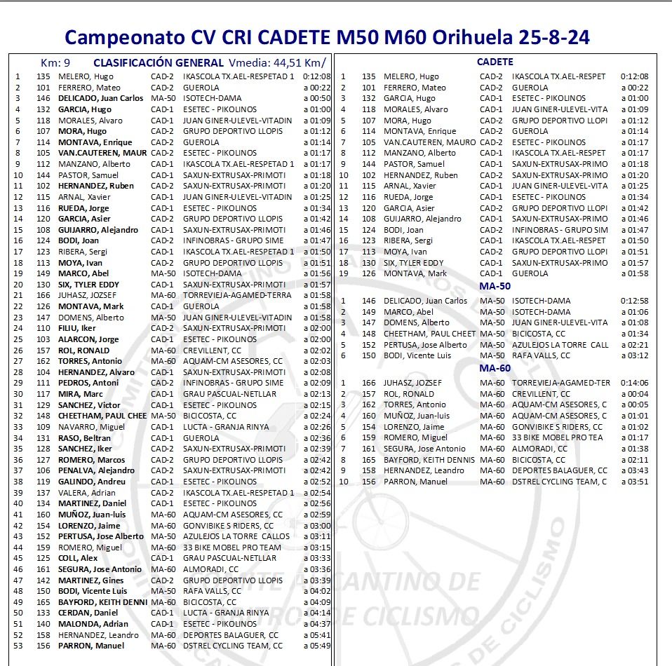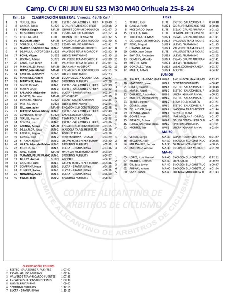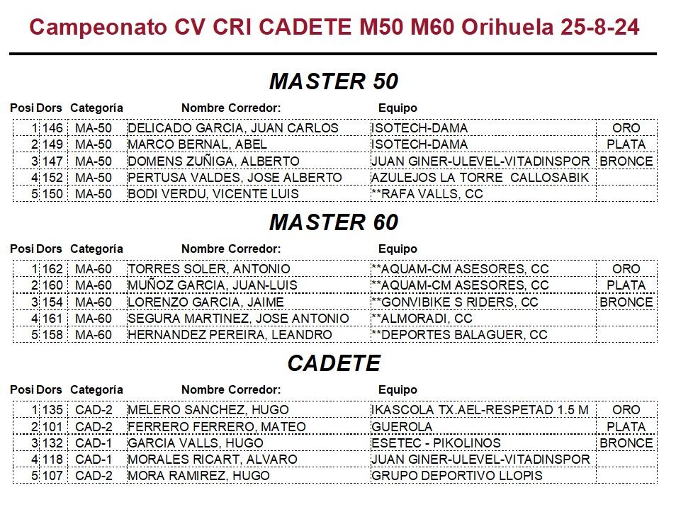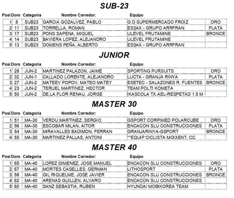 Los nuevos campeones autonómicos son Pablo García (Froiz), en Sub 23; Jaime Martínez (Sporting Pursuits), en Júniors; Hugo Melero (Ikaskola-TX.AEL), en Cadetes; Sergio Verdú (Gsport Corpimed), en M30; José Manuel López (Encacon), en M40; Juan Carlos Delicado (Isotech-Dama), en M50; y Antonio Torres (Aquan), en M60.