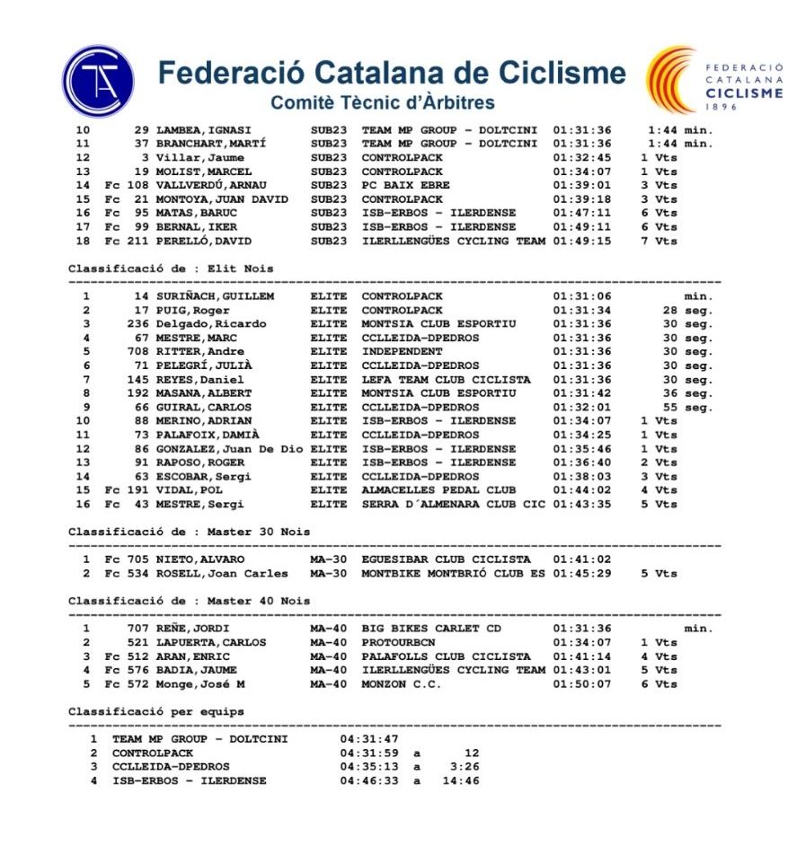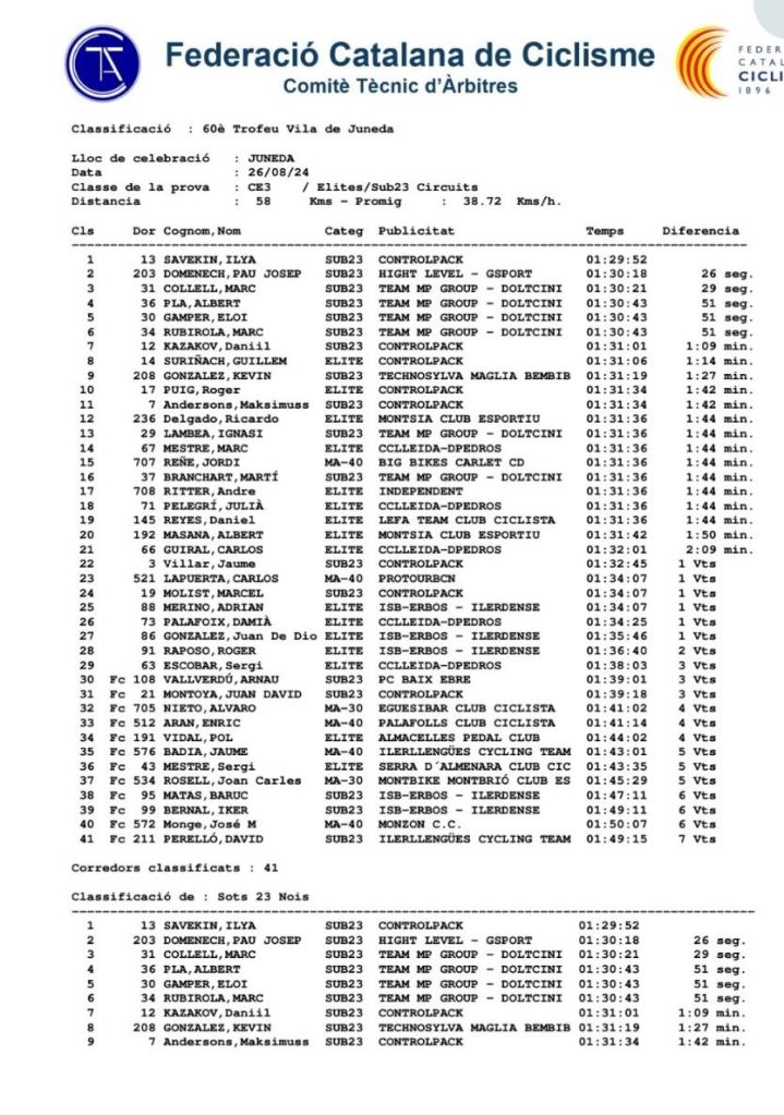 Savekin ha estado acompañado en el podio por Pau Josep Domènech (Hight Leves – Gsport), que ha entrado a 26 segundos, y Marc Collell (Team MP Group – Doltcini), que ha perdido 29 segundos con el vencedor en una carrera en la que les 10 primeros han entrado uno por uno. Con la disputa de la prueba garriguenca, la Challenge de las Tierras de Ponent ya ha disputado sus cuatro primeras carreras y se cerrará el lunes 2 de septiembre al 2º Criterium Les Borges Blanques – Memorial Sisco Peries .