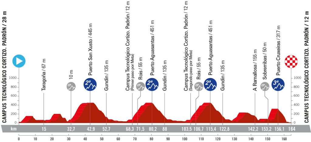 Llegaba entonces el encadenado final de tres puertos que presumiblemente debía marcar la etapa y que en un primer momento se ha vivido con calma. Tras superar el Alto de Vilachán (3ª categoría), se entraban en los últimos 50 kilómetros de etapa con una ventaja máxima de los cinco escapados de cerca de 6 minutos, lo que todo parecía indicar que tenían opciones de jugarse la victoria. El equipo Red Bull-Bora-Hansgrohe ha enfilado el pelotón con un fuerte ritmo camino del Alto de Mabia (2ª categoría), pero finalmente no ha habido movimientos relevantes.